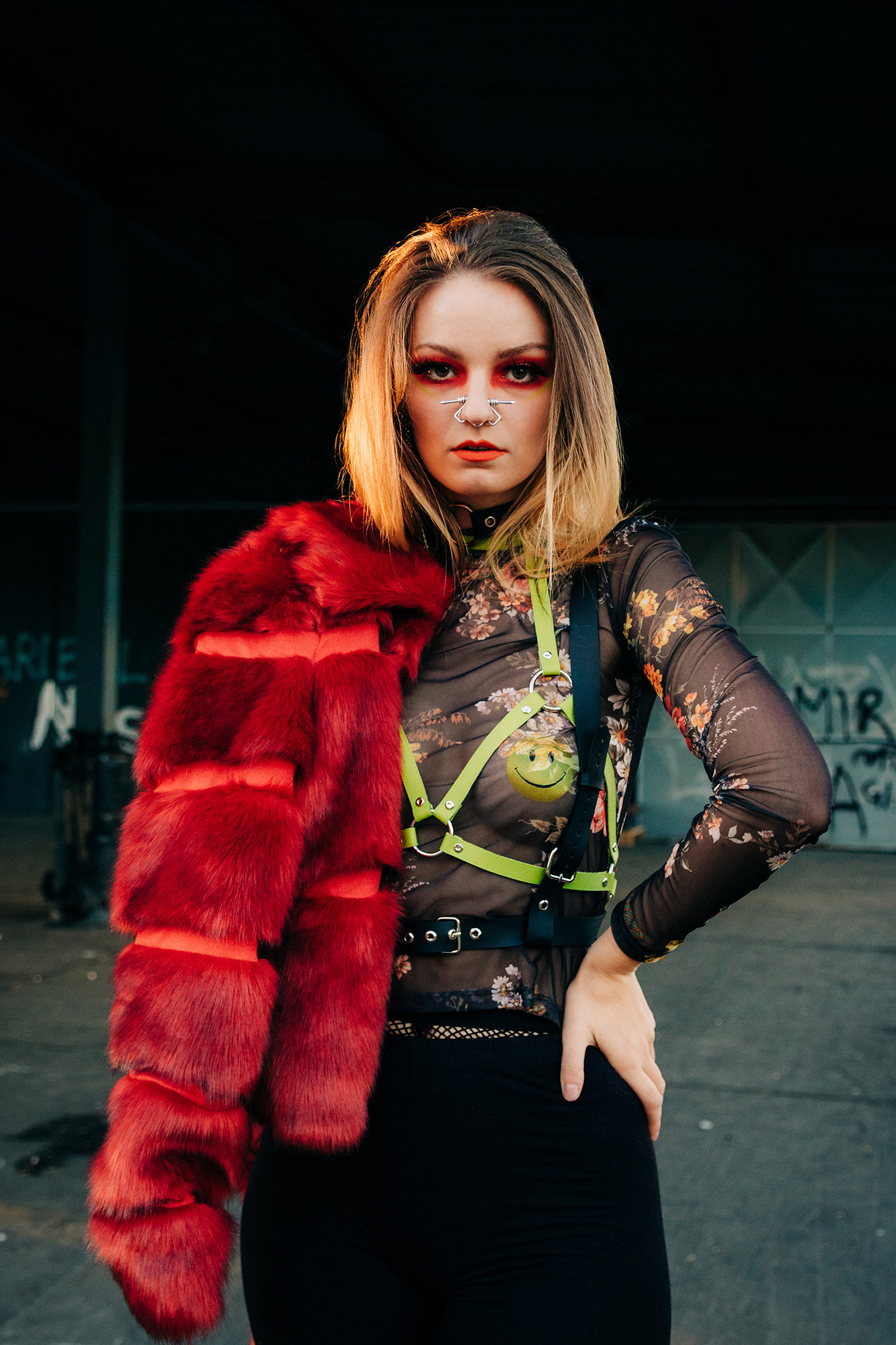 Portrait of a girl with nose piercing wearing a harnish and red fur coat