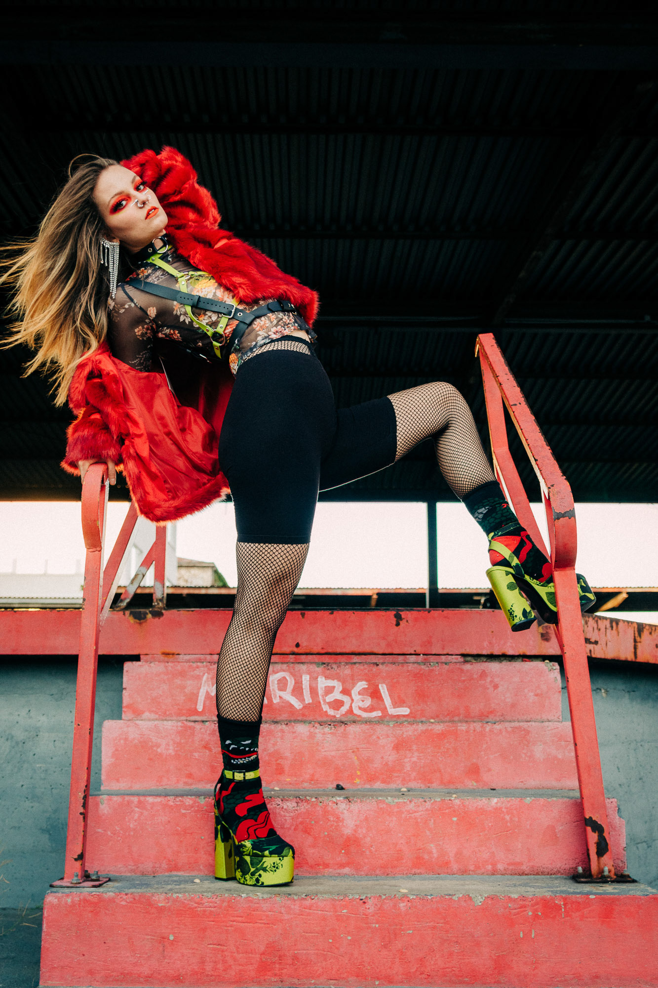 Portrait of a girl with red makeup, a red fur coat, a leather harness and high heels sitting at an industrial area